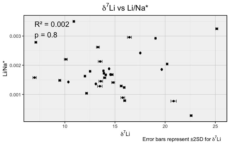 Relationship between lithium isotope composition (δ⁷Li) and the Li/Na* ratio in river solutes collected from the East River watershed, Colorado, during July 2024.